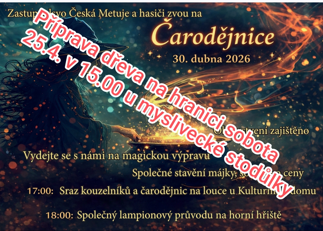V sobotu 25.4. v 15.00 sraz u myslivecké stodůlky na přípravu dřeva na čarodějnice. Přijďte pomoc, rukavice s sebou.